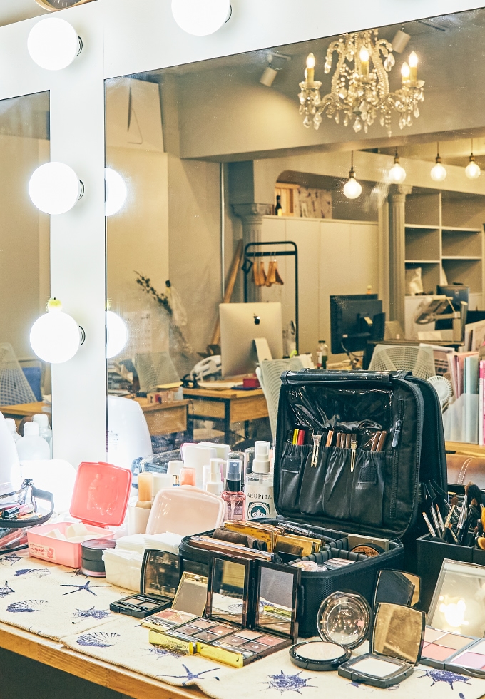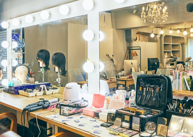 S-SIZEのヘアメイク部は、舞台やテレビに出演する俳優・タレント・モデルのヘアメイクはもちろん、弊社が運営する子供写真館のお客様対応や、舞台で使用するウィッグ製作を担うなど、被写体やステージに〝華〟を添えています。