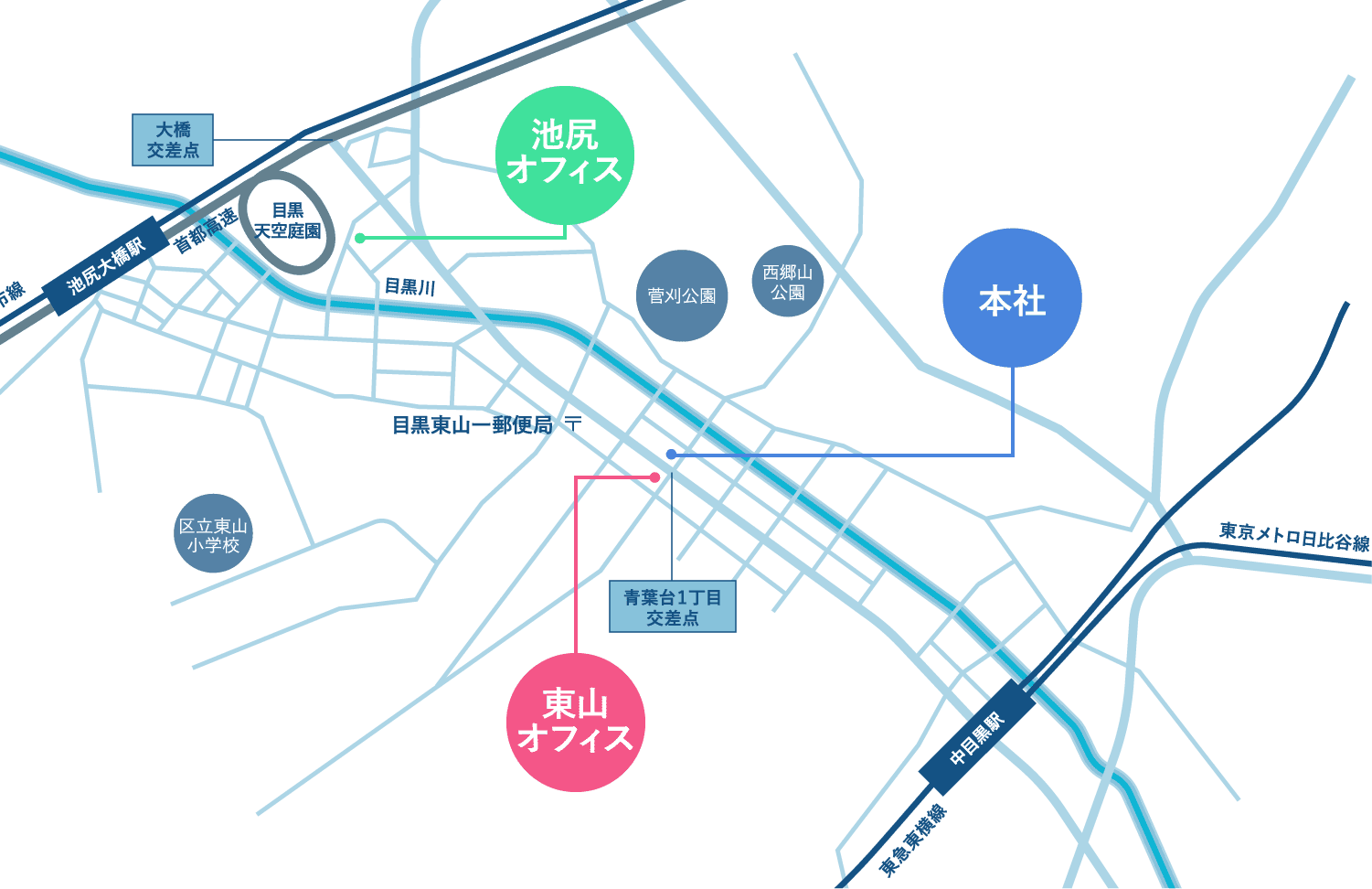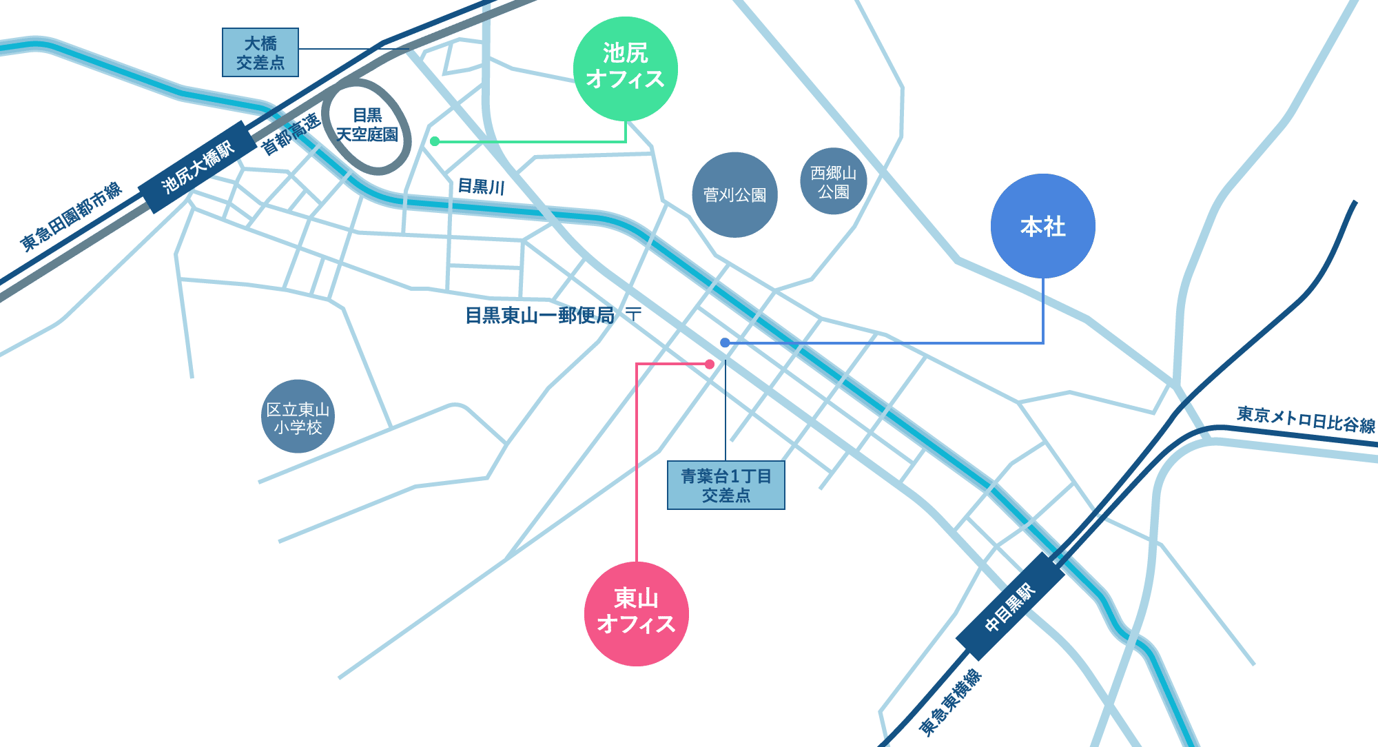 東急田園都市線「池尻大橋」駅 東口を出て徒歩6分。目黒天空庭園の東側向かいにございます。