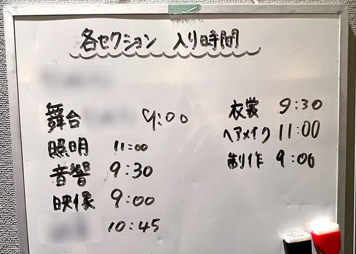 メイクの直しや着替え、決まった開始時間を気にしつつ、出演者へ声かけを行います。