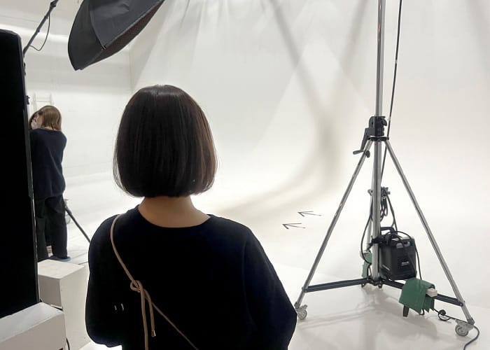 撮影スタート!どんなカットが欲しいのか、デザイナーさん、カメラマンさんと確認しつつ、撮影に立ち合います。また、宣伝部と連携を取りつつ、SNS用の宣伝動画も撮影します。