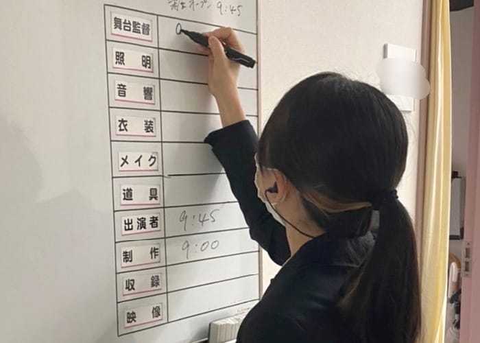 昼夜2公演。本番中はキャストの怪我など万が一の場合に備えて待機をしつつ、劇場にこもりっきりになる皆さんに少しでも楽しんでもらえるようケータリングや掲示物を華やかにしたりと快適に過ごしてもらえるように工夫を凝らしています。